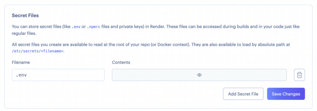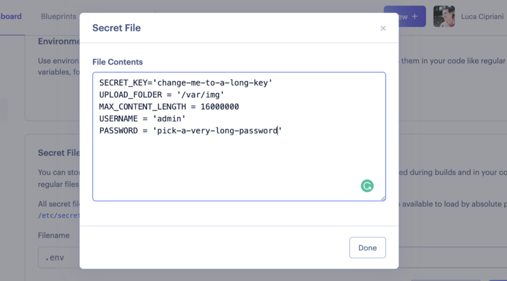 Now go to the advanced section in the interface and set up a secret file. You can name it .env and paste the following text (changing it with your own values):