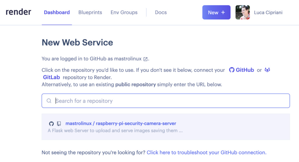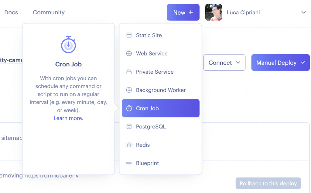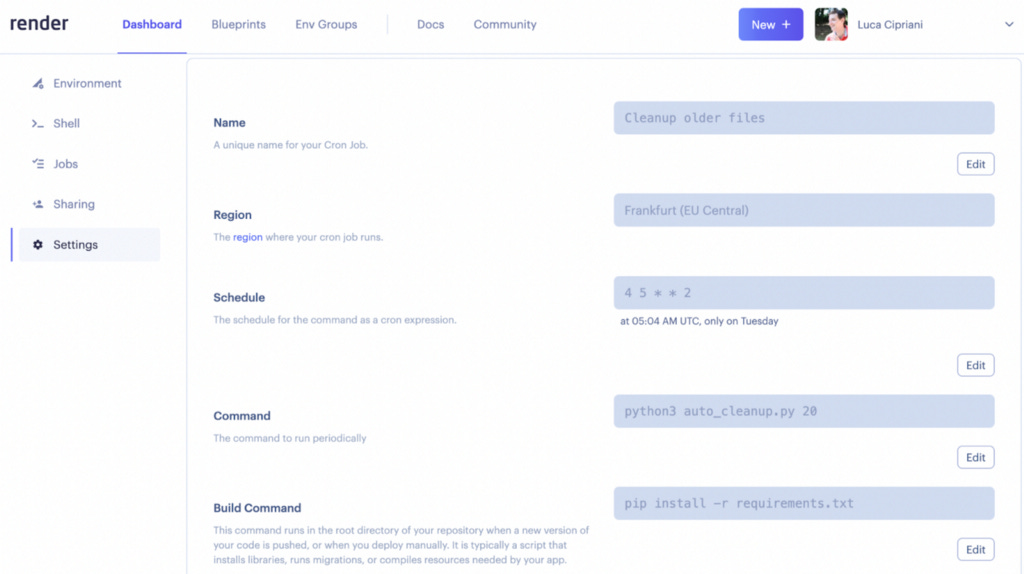 In the Render dashboard, I created a new Cronjob service. The nice thing about these is that you only pay for the second of execution. In our case, we will end up paying at most $1/month.
