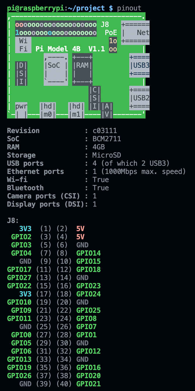 It is easy to see the pinout of our Raspberry by using the pinout command. For a full explanation of every pin, you can take a look at Pinout.xyz.