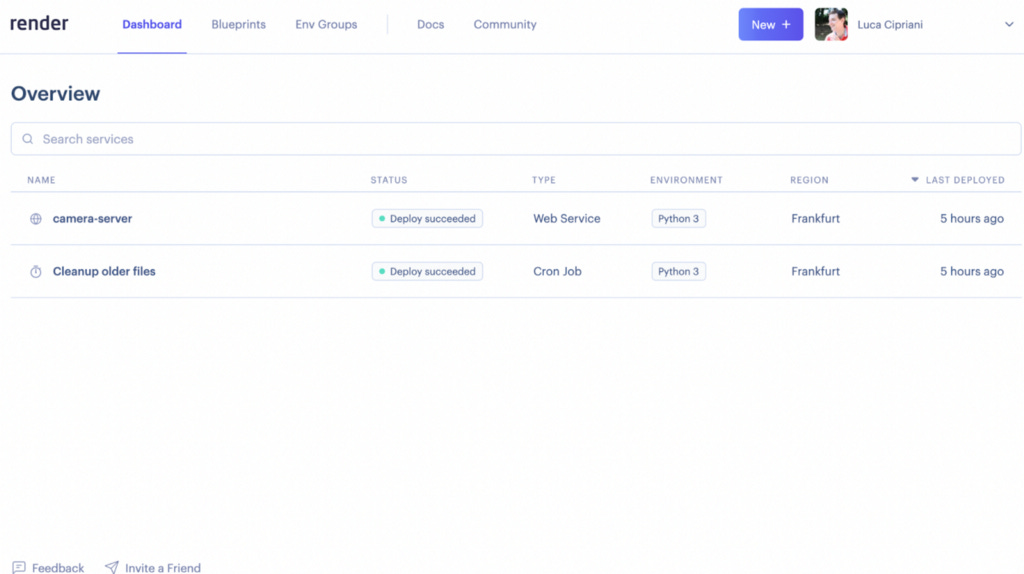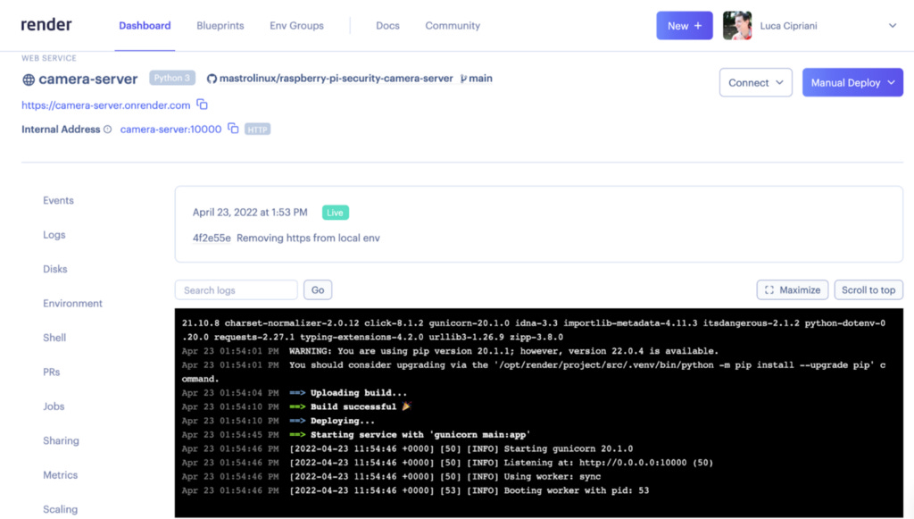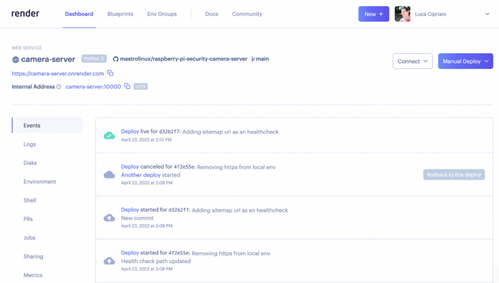 Once successful, you will get the server URL at the top of the page. In my case, I claimed https://camera-server.onrender.com. Feel free to check out my deployment at https://camera-server.onrender.com/sitemap (since Render servers are protected from DDoS attacks too!)
