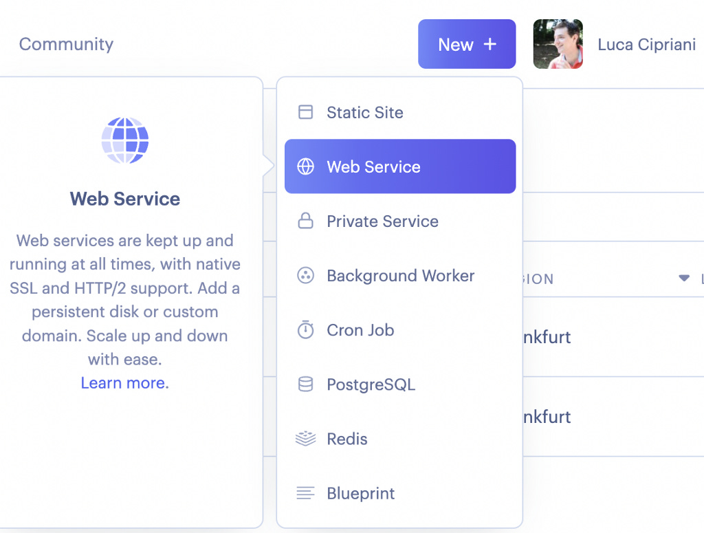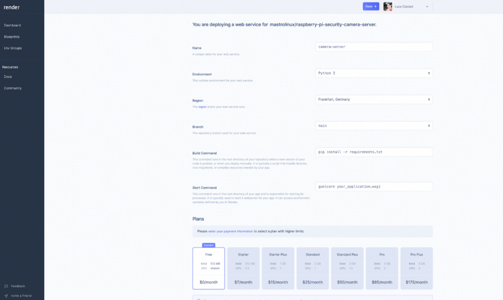 Once selected, it is time to configure our server. You can select the free plan for now, but we will need a persistent disk immediately after, so it’s best if you choose the starter plan.