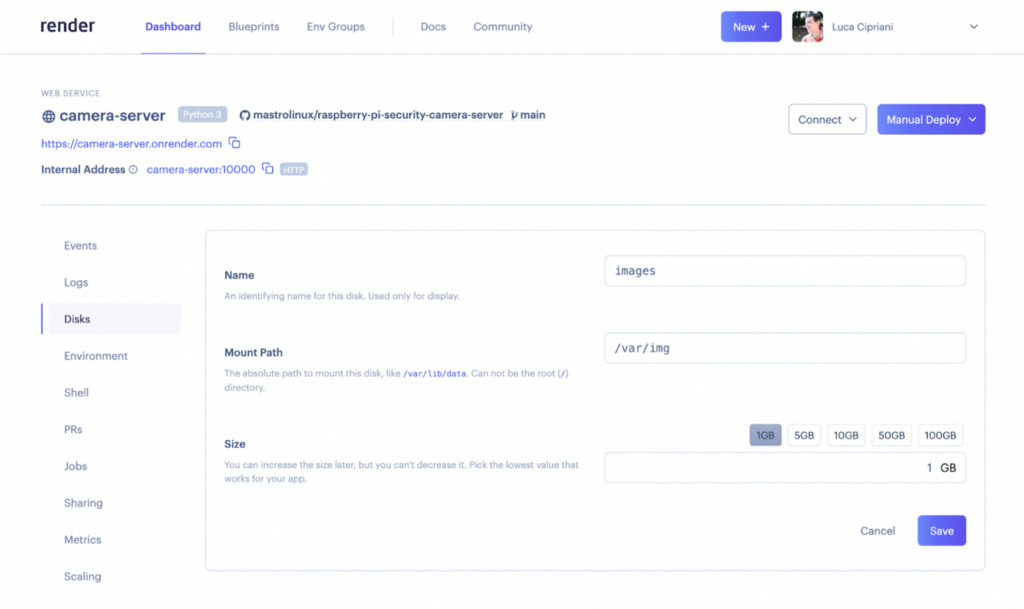 Creating a persistent disk on Render is trivial and can be done using the interface. Just click on the disk section on the left, select a name for it, and a mount path. Here are my values: